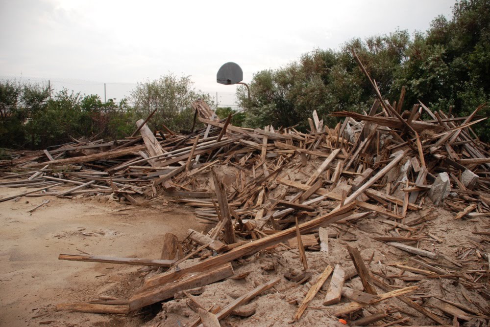 Unlike neighboring Far Rockaway, few artifacts remain from Edgemere's bungalow era, other then dozens of broken fire hydrants. "In the early 60's -- some say particularly because of the coming of the jet age and fast flights to tropical climes -- the Rockaway economy took a turn toward the terrible. The city, in what one local official termed one of its ''urban renewal binges,'' tore down thousands of bungalows, leaving wide tracts vacant or dotting them with low-income housing projects," according to The NY Times. Mayor John Lindsay had hopes "that the federal government would provide money for new housing. But... ultimately, Rockaway fell victim to the economic downturn of the 1970s," according to The NY Times. Today, even the historic boardwalk along Edgemere's shore has been ripped away, to be replaced with a new concrete path. Lumber from the old boardwalk covers a nearby athletic field, which has also been abandoned.